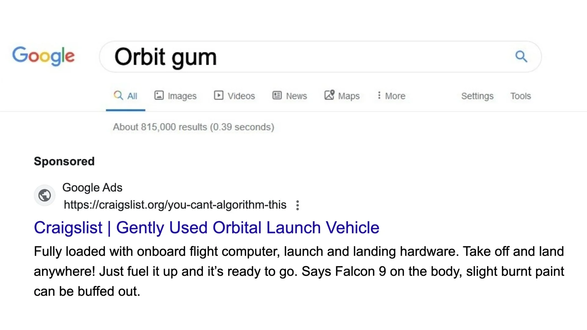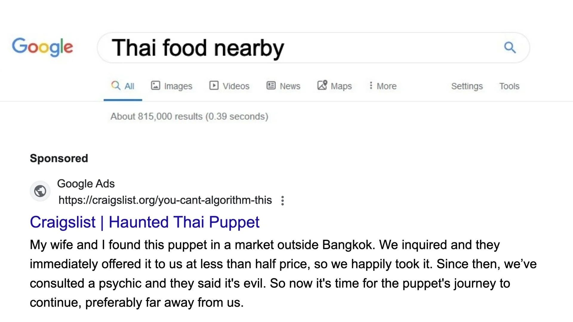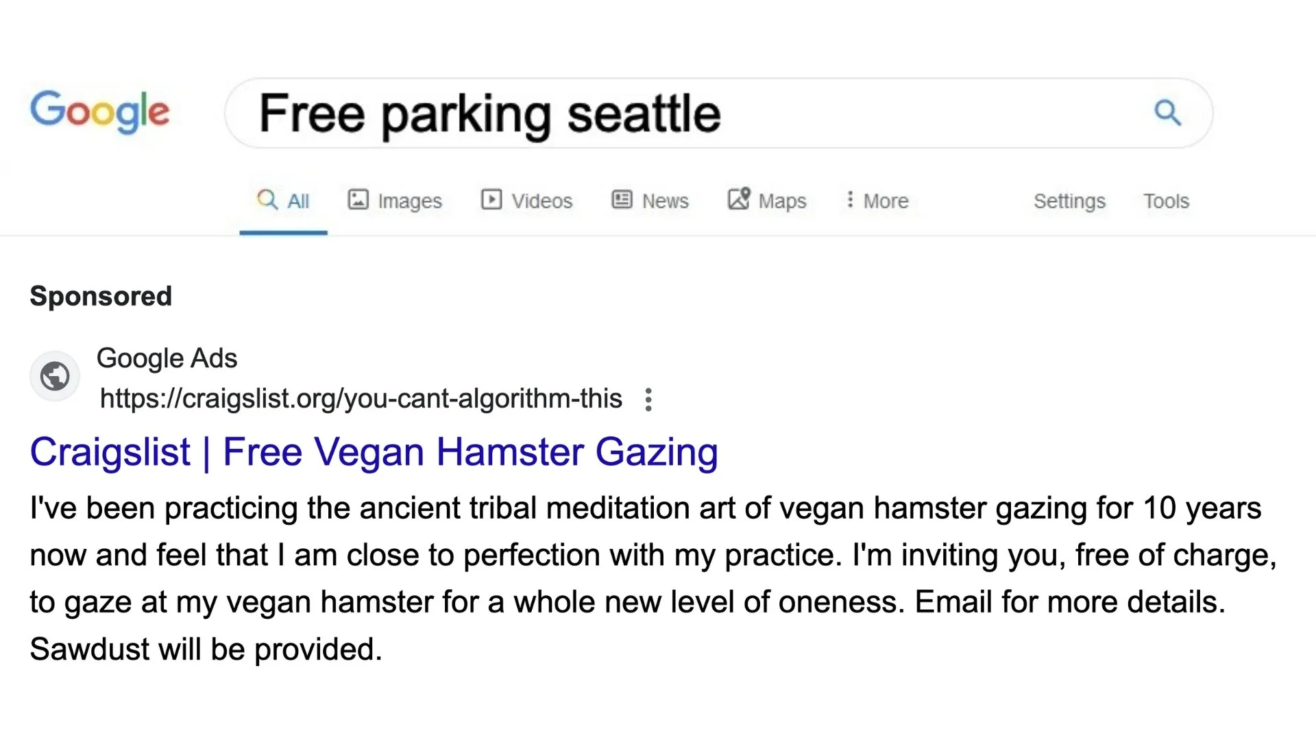 A paid search hijack where seemingly ordinary Google search results are converted into sponsored ads, diverting users to a curated feed of Craigslist's most bizarre listings.