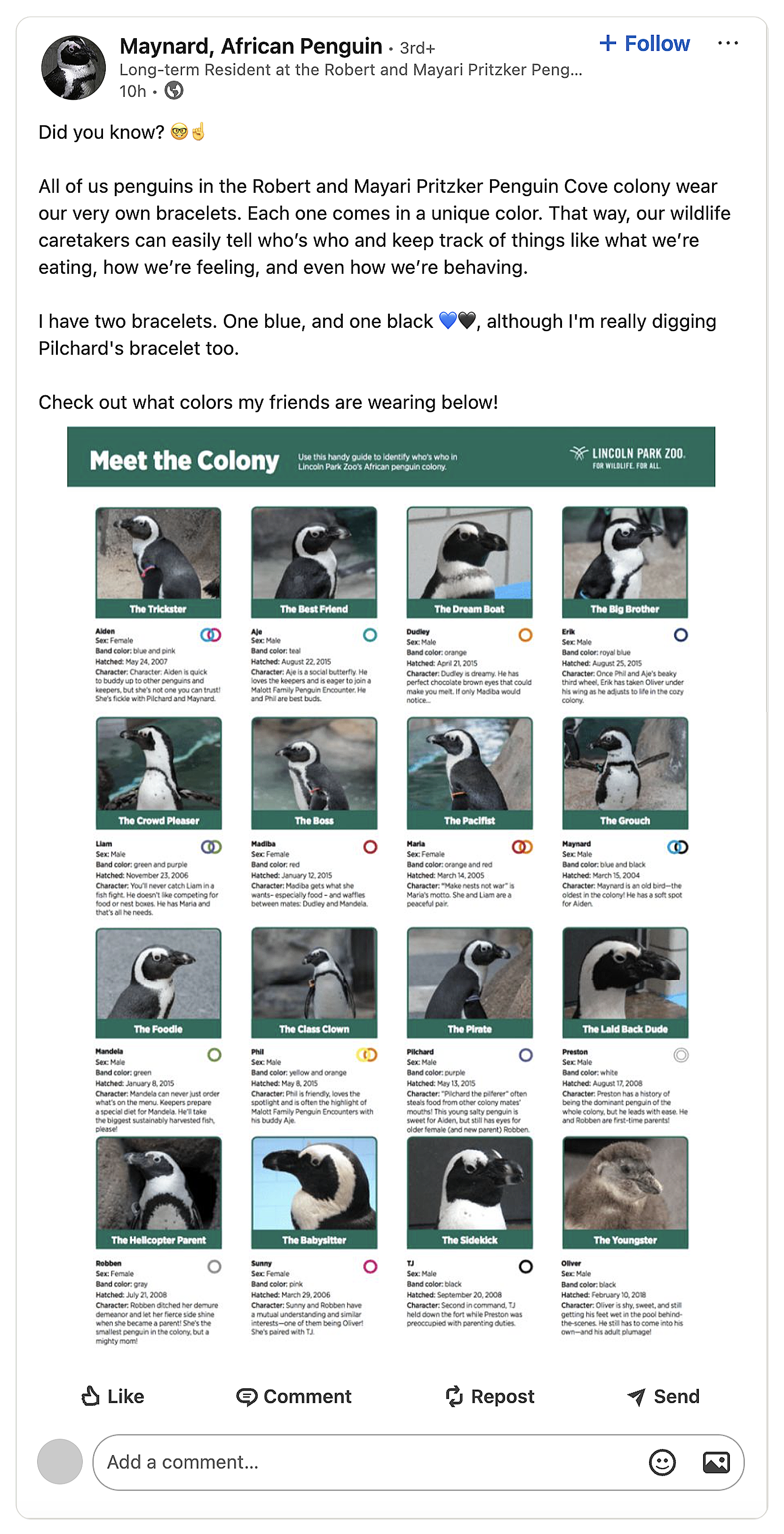 The Lincoln Park Zoo is giving their animals LinkedIn profiles, turning a two-minute stop into a deep, engaging dive.